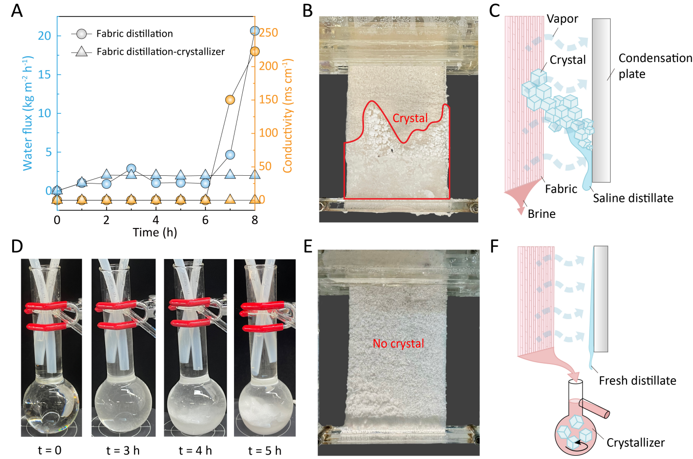图1. FDC用于蒸发结晶的可行性验证。(A)FD与FDC实验中的水通量及产水电导率随时间变化曲线。(B)FD实验后织物表面的照片。(C)单独FD技术用于盐水结晶的失效机理示意图。(D)FDC实验过程中结晶器的照片。(E)FDC实验后织物表面的照片。(F)FDC系统实现蒸发结晶的原理示意图。