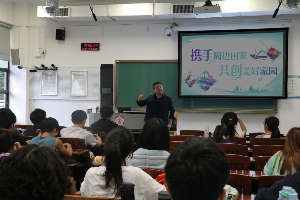 12月2日下午,马金星以“携手周边国家,共创美好家园”为主题,从周边外交的战略重要性切入,系统阐释了新时代亲诚惠容的周边外交理念。他结合中老铁路、雅万高铁等“一带一路”合作典范,以及具体跨境生态合作案例,生动展现了中国与周边国家在互联互通、互利共赢、生态共治等领域的丰硕成果。他强调,作为环境生态工程专业的学子,要立足“人类命运共同体”理念,认识到生态保护的跨国界属性,既要深耕专业知识,也要拓宽国际视野,未来在参与跨境生态治理、资源可持续利用等工作中贡献青春力量。