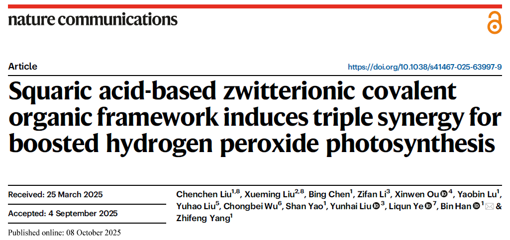 杨志峰院士团队韩彬教授课题组在Nature Communications上发表了题为“Squaric acid-based zwitterionic covalent organic framework induces triple synergy for boosted hydrogen peroxide photosynthesis”的研究论文。韩彬教授为论文通讯作者,自拍偷拍