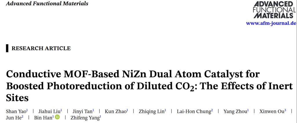 杨志峰院士团队韩彬教授课题组在人为源二氧化碳转化研究中取得重要进展,研究成果以“Conductive MOF-Based NiZn Dual Atom Catalyst for Boosted Photoreduction of Diluted CO2: The Effects of Inert Sites”为题发表于《Advanced Functional Materials》。韩彬教授为论文通讯作者,自拍偷拍